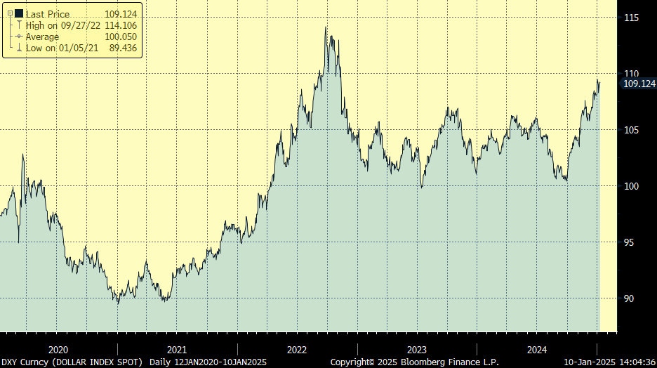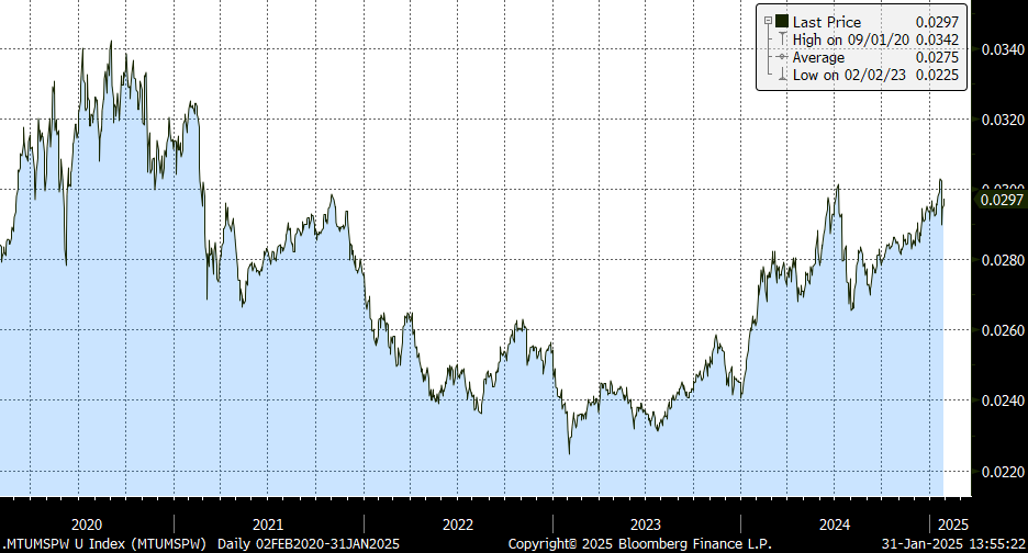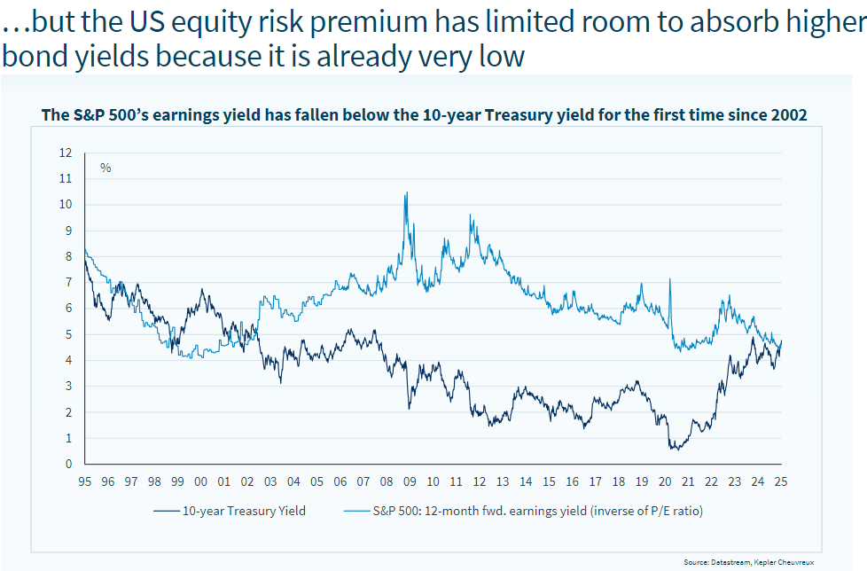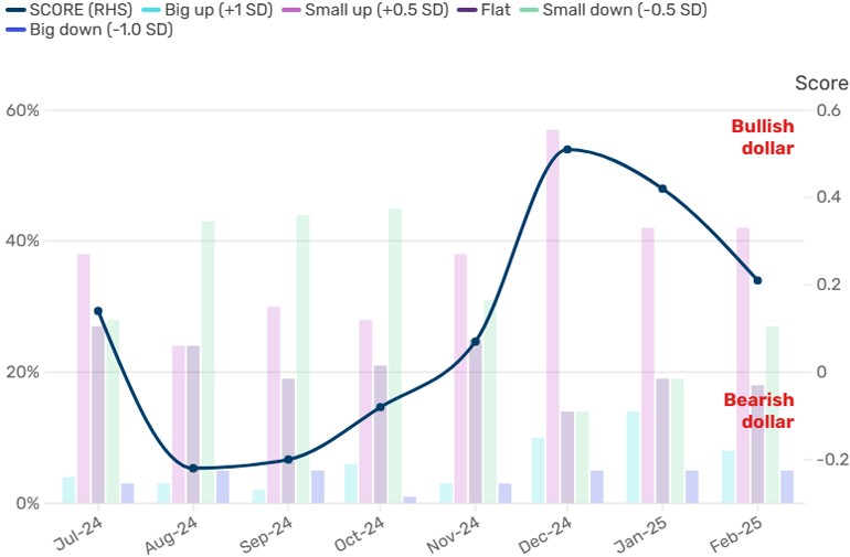 Finalmente, parece más probable que se produzcan riesgos financieros más amplios (aunque su probabilidad sigue siendo baja) y podrían impulsar un endurecimiento de las condiciones financieras. Matt King, fundador de Satori Insights, señala posibles detonantes que podrían revertir el estatus de “refugio seguro” de Estados Unidos (en el que las huidas hacia la seguridad se asocian con un dólar más fuerte y menores rendimientos de los bonos del Tesoro). “Una combinación de preocupaciones en torno a la irresponsabilidad fiscal, la independencia de la Reserva Federal y algunas de las propuestas más extremas… como parte de un acuerdo de Mar-a-Lago podría hacerlo”, dice.