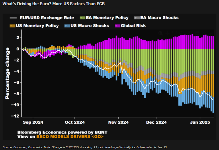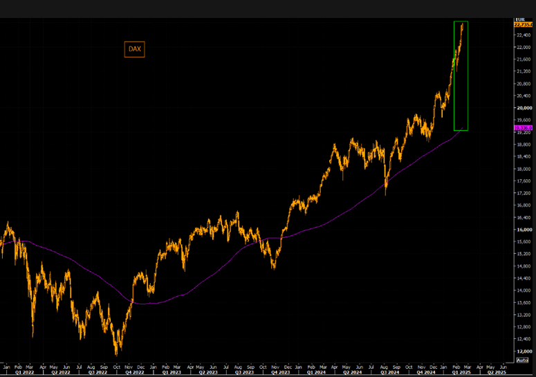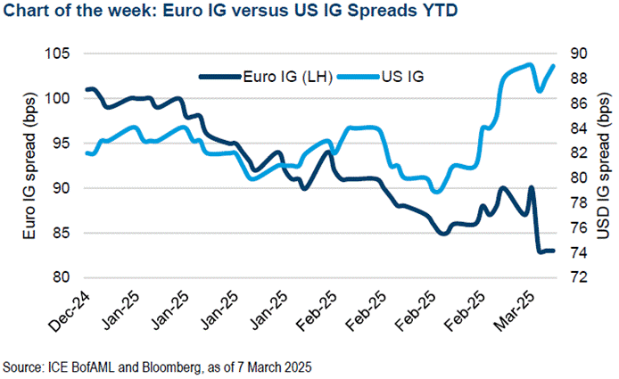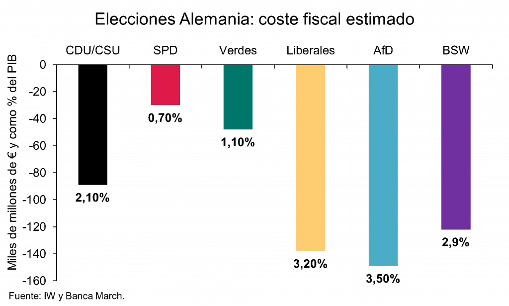 La política estadounidense también es responsable del repentino cambio de opinión de los mercados sobre Europa, que ahora ve por fin la posibilidad de un drástico cambio de política económica. Sacudida por el desprecio de EEUU a las antiguas alianzas de seguridad y el cambio en su política sobre Ucrania, Alemania se está planteando una relajación de sus antiguas restricciones fiscales. Esto podría traducirse en un aumento del gasto en defensa, mayores inversiones en infraestructura y mayor financiación regional.