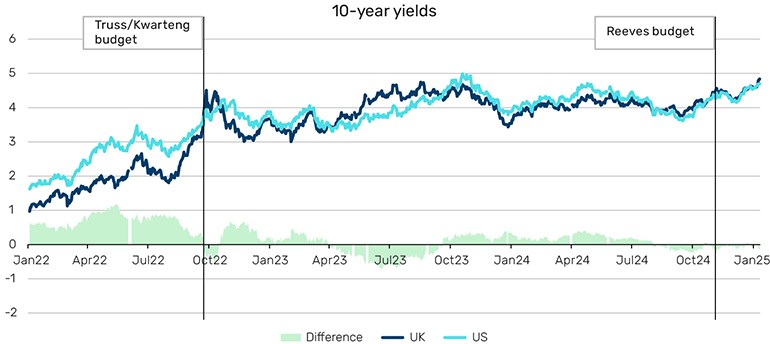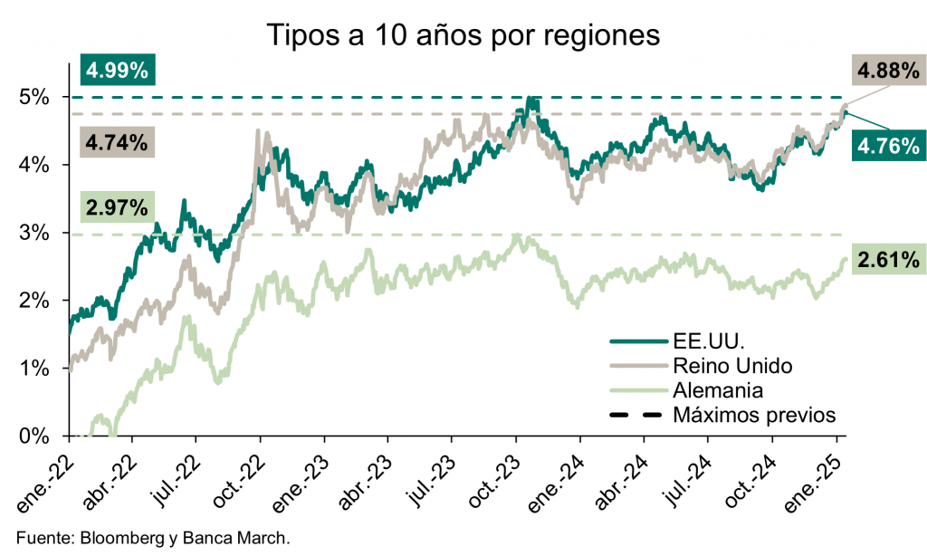 Los planes de la Administración para tapar el déficit con ingresos arancelarios (en particular si son intermitentes) y el llamado Departamento de Eficiencia Gubernamental son altamente cuestionables. Los costes de endeudamiento de EEUU ya son altos; la laxitud fiscal aumenta los rendimientos. La demanda de bonos del Tesoro de EEUU enfrenta otros posibles vientos en contra, como el próximo aumento de las emisiones de bonos alemanes. Ahora es más fácil imaginar que Estados Unidos quede atrapado en un círculo vicioso de mayores rendimientos y mayores previsiones de deuda.