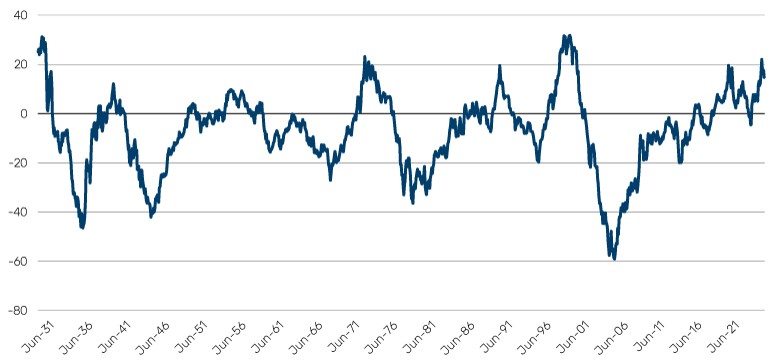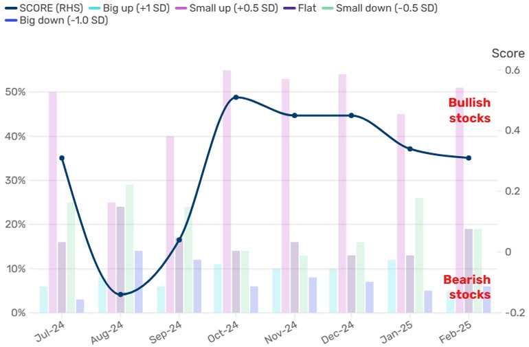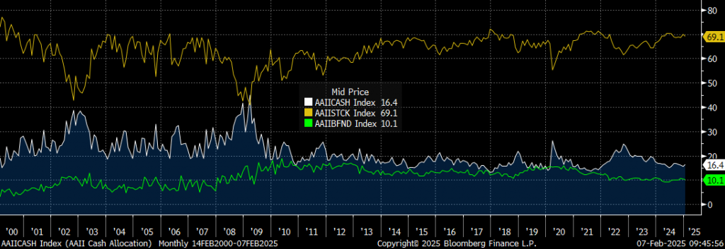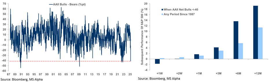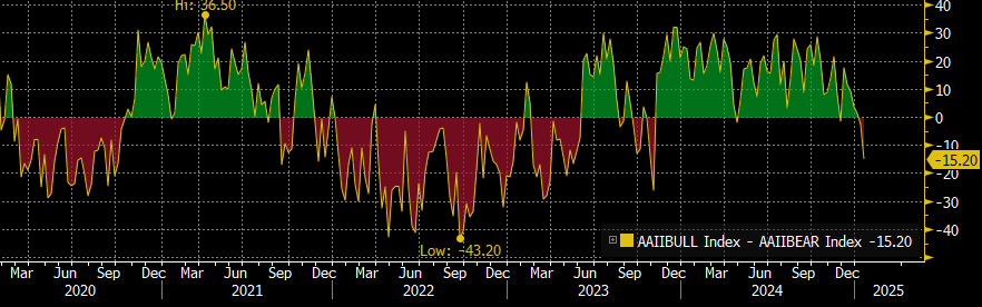 El diferencial alcistas menos bajistas de la AAII mide la diferencia entre el porcentaje de inversores alcistas y bajistas, ofreciendo una instantánea del sentimiento de los inversores individuales. En la última encuesta semanal, que finalizó el 6 de marzo, el sentimiento alcista, expectativas de que los precios de las acciones suban en los próximos seis meses, se sitúa en sólo el 19%, la mitad de la media histórica. Mientras tanto, el sentimiento bajista es históricamente elevado, cercano al 60%, frente a una media ligeramente superior al 30%. Con los actuales niveles de valoración y confianza, el riesgo de una corrección no es en absoluto inverosímil.