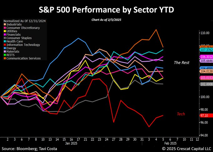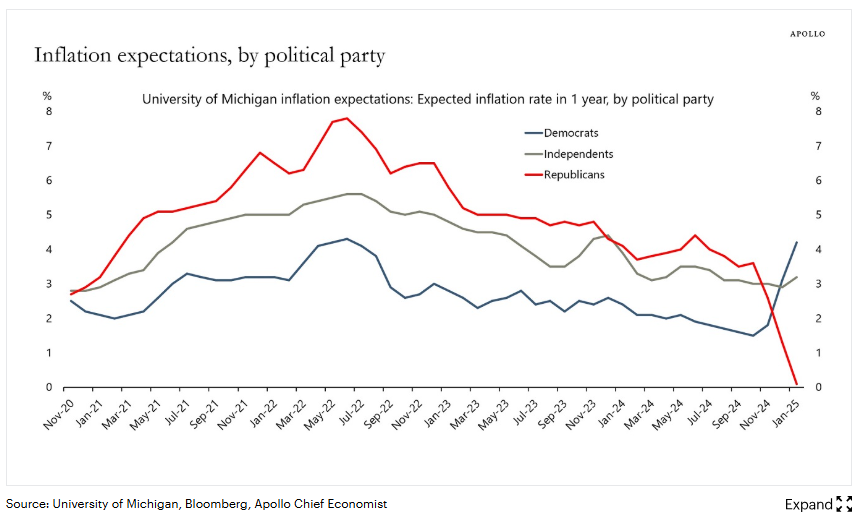 Esto es solo un anticipo; se esperan más aranceles. Y aunque el presidente tiene un don para retrasar los plazos, el impacto en el sentimiento ya es claro. La confianza se ha desplomado. Las expectativas de inflación y desempleo de los consumidores se han disparado. Es un triplete amenazante. Los hogares todavía están tratando de digerir un aumento del 20% en el nivel de precios después de la pandemia. Cabe destacar que el consumo real cayó en enero por primera vez en casi dos años. Ahora es más probable que haya un patrón de gasto prudente.