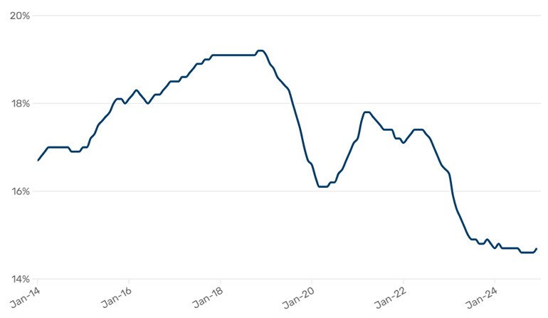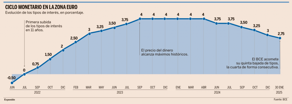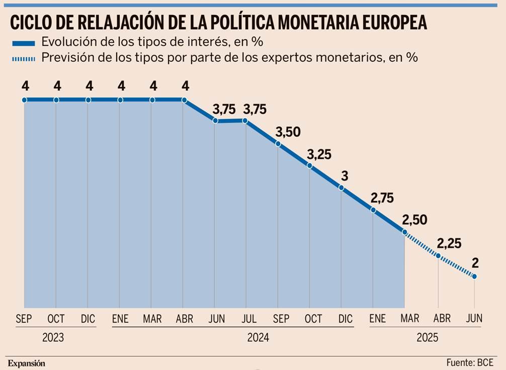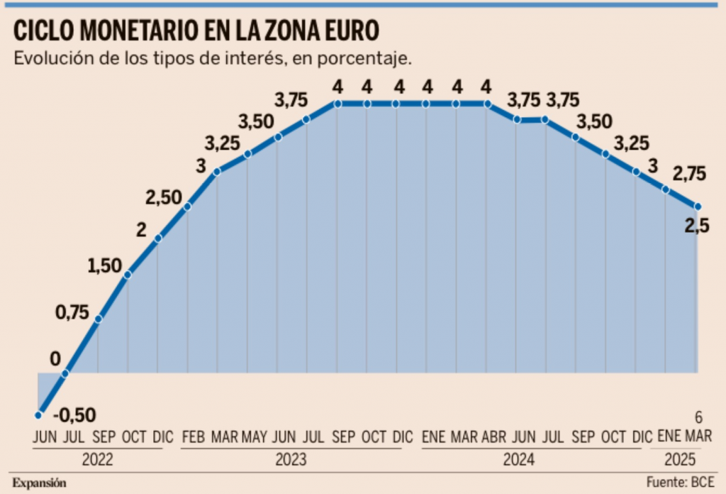 La mayoría de analistas esperan dos recortes más de los tipos de interés por parte del Banco Central Europeo. “El entorno está lleno de incertidumbre. Eso nos hará estar especialmente atentos y ser ágiles a la hora de reaccionar a los datos. Bajaremos más los tipos o haremos una pausa en función de lo que requiera la situación”, aseguró la semana pasada la presidenta Lagarde. La amenaza arancelaria de Donald Trump desde Estados Unidos y la agitación en relación a la guerra entre Rusia y Ucrania, con el subsecuente anuncio del aumento del gasto en la zona euro para rearmarse, amenaza con sacudir a las economías. Sin embargo, los analistas más influyentes en el campo de la política monetaria, consultados periódicamente por el BCE, consideran que se conseguirá ejecutar las dos rebajas de tipos para dejarlos en el 2% y finalizar ahí el ciclo de relajación de las condiciones de financiación. Este nivel se encuentra en medio de las estimaciones que el banco central ha publicado sobre la famosa tasa neutral, esa referencia en la que la política monetaria no supone un lastre ni un estímulo para la inflación y que se sitúa entre el 1,75% y el 2,25%. Una vez acometidos estos dos recortes previstos por los analistas, el BCE habrá recortado sus tasas por valor de 200 puntos básicos hasta ese 2%, niveles mínimos de diciembre de 2022. Pese a todo, los tipos se quedarían 250 puntos básicos por encima del nivel que alcanzó tras la crisis de deuda soberana, en el -0,5%. Existen, sin embargo, divergencias entre los analistas monetarios consultados por el BCE. Aunque el grueso apunta a dos recortes más de los tipos, alrededor de un 25% considera que se seguirán bajando las tasas hasta en un punto porcentual, llegando al 1,5% en diciembre de este mismo año. Según estos analistas, en minoría en la encuesta del BCE, el banco central mantendría ese nivel de precio del dinero durante todo 2026. Sólo a partir del siguiente año empezaría a elevarlo de nuevo para converger, después de dos alzas de 25 puntos básicos, en el 2%, nivel en el que el consenso calcula que se mantendrán a largo plazo.