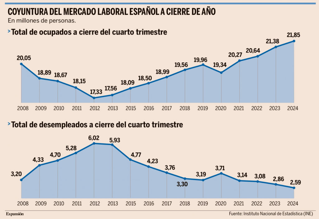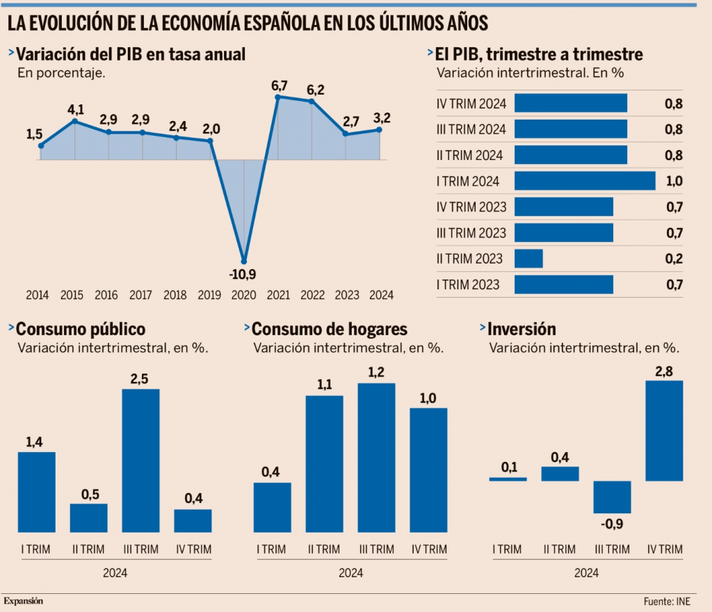 Como todos los analistas, también en estas compañías se sorprendieron cuando el INE anunció que en el último trimestre de 2024 el PIB había seguido una línea de mantenimientos respecto al trimestre anterior y que, provisionalmente, se estimaba que había aumentado un 0,8%, con lo que la economía ese año había crecido en términos reales un 3,2%.