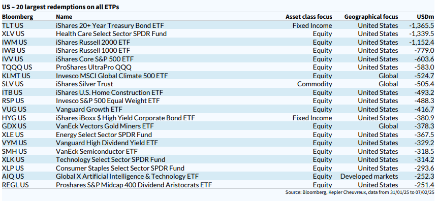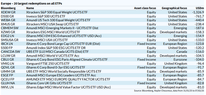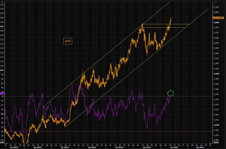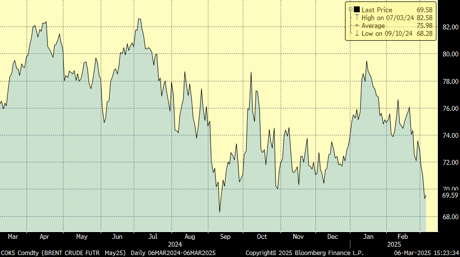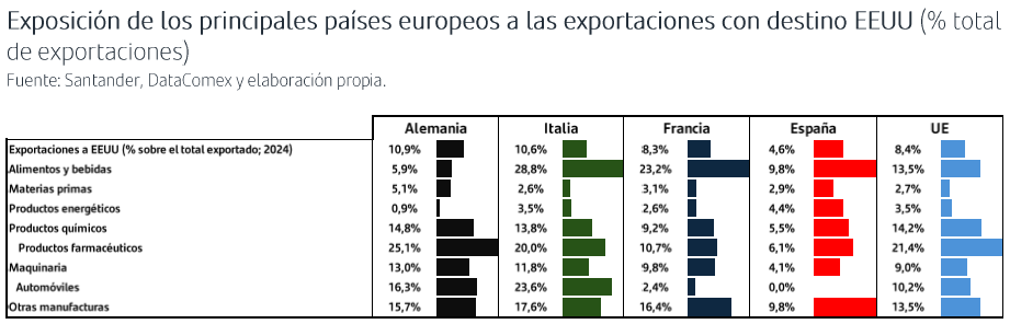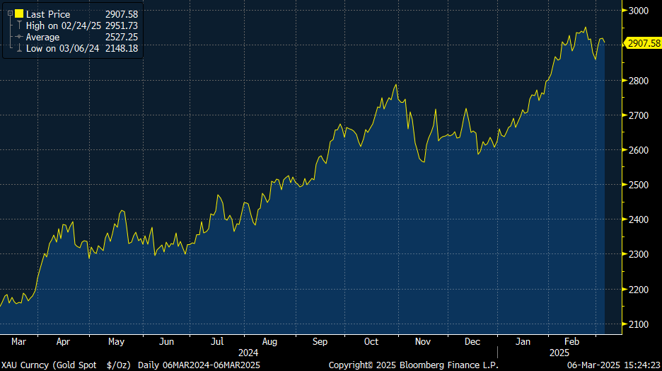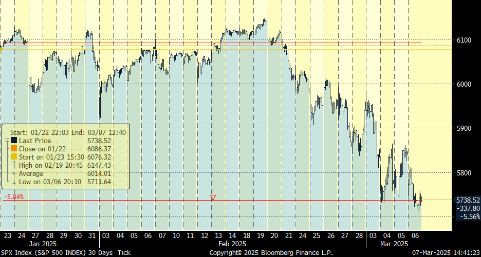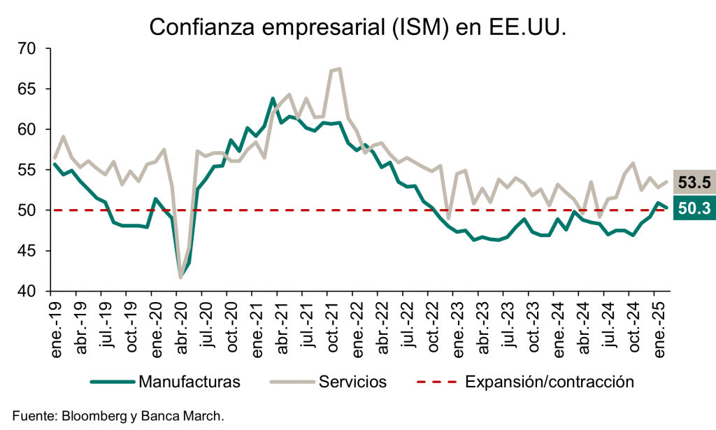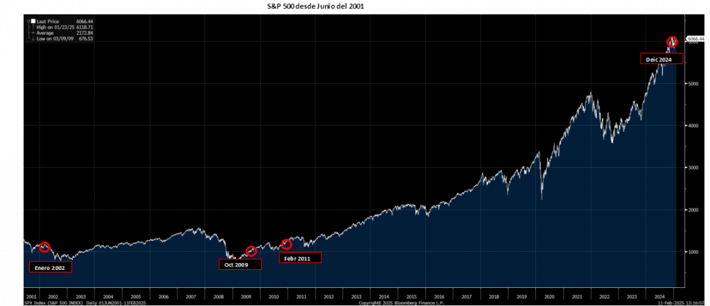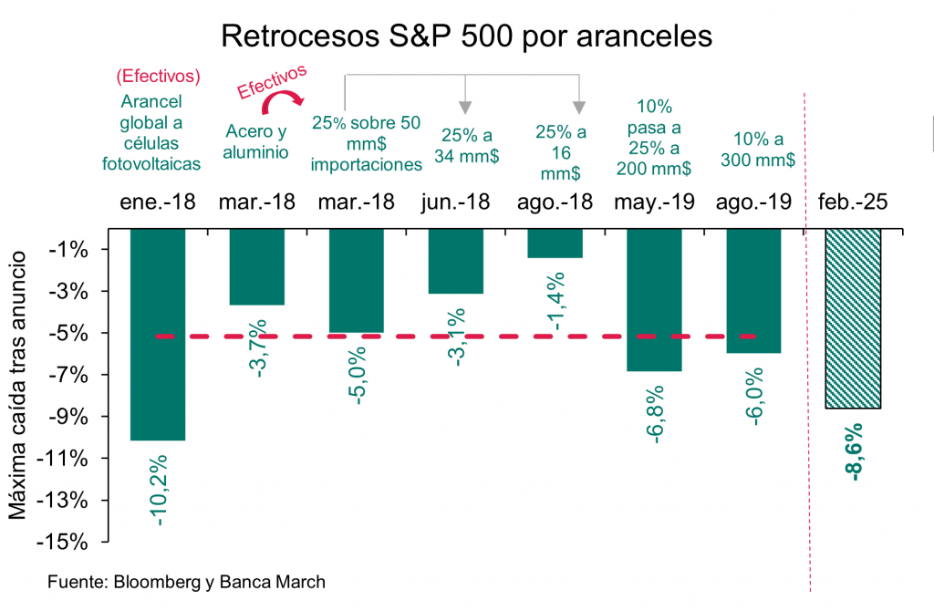 Los valores tecnológicos, especialmente los Siete Magníficos, han caído con fuerza esta semana, el Nasdaq 100 lleva una corrección del 13% desde sus máximos, el martes sufrió su peor sesión desde Septiembre del 2022 (-4%), y el Nasdaq Composite del 13,5%, Nvidia ha perdido un 28% desde enero a pesar de buenos resultados, Microsoft -18%, Meta -19%, Apple -12%, Amazon -20%, Google -19%, y Tesla -53%, con una caída del 15% este lunes tras una revisión de las previsiones de ventas por parte de UBS. Los temores de recesión en Estados Unidos aumentaron esta semana, afectando a otros sectores, los bancos sufrieron, Delta Airlines advirtió sobre la erosión de la confianza del consumidor… El S&P 500 marcó el martes señal de sobreventa en un nivel no visto desde Agosto del 2024 (con la caída después del famoso yen carry trade sell-off de comienzos de mes). Los hogares americanos son muy sensibles a la evolución de la bolsa, en la que acumulan un 26% de su patrimonio, los niveles más altos desde el 2021. Además, el 10% de los hogares de mayor renta, que acumula un 39% de todas las acciones, es responsable de casi la mitad del consumo por lo que, la prolongación o debilitamiento de la situación actual tendría consecuencias en el gasto de los hogares y mermaría la popularidad del actual presidente.