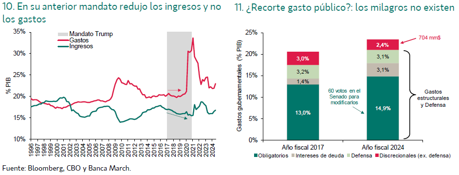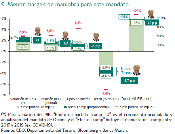 ¿Tal vez las rebajas de impuestos y las medidas de desregulación de Trump en favor del crecimiento? En primer lugar, todavía no han comenzado. En segundo lugar, se verán contrarrestadas por los elementos anticrecimiento de su agenda política. Las rebajas de impuestos aumentarán las ganancias, pero la capacidad de las empresas para hacer algo con esos beneficios se verá limitada por la incertidumbre y los mayores costes de importación. Reducir la burocracia puede apoyar la inversión, pero monitorizar los nuevos regímenes arancelarios y las exenciones supone en sí mismo una enorme carga regulatoria adicional.