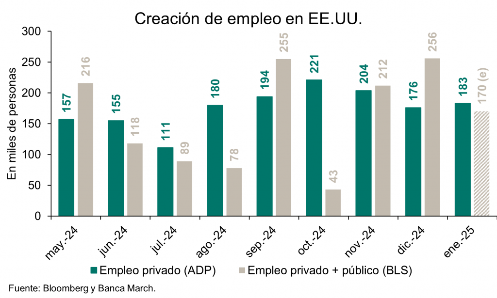 Luego vienen los objetivos de la nueva Administración. Más allá del impacto de la incertidumbre política en el sector privado, Evercore ISI estima que los esfuerzos de recortes de costes en el sector público de Elon Musk podrían eliminar un total de medio millón de puestos de trabajo en EEUU este año. En un escenario extremo, esa cifra podría llegar a más de 1,4 millones. Una ofensiva prevista contra los inmigrantes indocumentados, que representan al menos el 5% de la fuerza laboral, se sumará a las pérdidas de empleo.