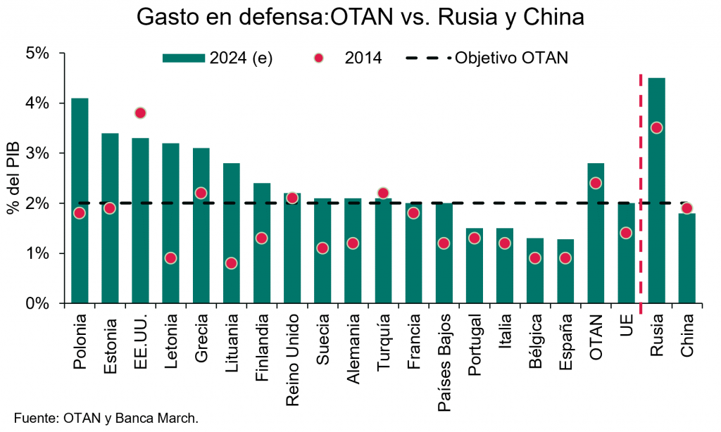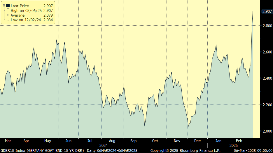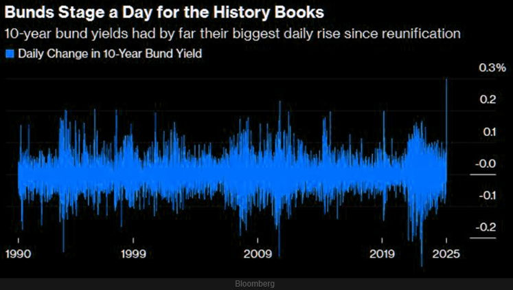 En Alemania, los Verdes en conversaciones con la CDU/CSU y el SPD para alcanzar un acuerdo entorno a los planes fiscales anunciados la semana pasada, proponen elevar el umbral para la exención del gasto en defensa del freno de la deuda al 1,5%, y ampliar la definición de «defensa» para incluir inversiones en infraestructura y la transición hacia energías limpias. Las conversaciones de este lunes no terminaron con una declaración oficial, pero los Verdes siguen negociando y creen que aún hay margen para llegar a un acuerdo en la próxima semana.