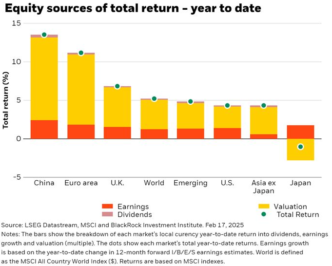 Hay tres factores fundamentales que sustentan el reciente giro de 180 grados en las recomendaciones de consenso sobre acciones, bonos y divisas: las crecientes dudas sobre la economía estadounidense; un posible “momento Sputnik” en Europa propiciado por un posible cambio en Alemania en materia de política fiscal y la financiación europea; y los indicios de una respuesta política más contundente por parte de China. La creencia en el excepcionalismo estadounidense se ha deteriorado, no sólo por la caída de las acciones en Wall Street sino también por la caída de los rendimientos de los bonos debido a las preocupaciones sobre el crecimiento y la devaluación del dólar.