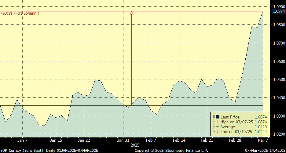 Trump está teniendo unos efectos a nivel global que pocos podían esperar cuando fue reelegido, Alemania ha dejado a un lado la austeridad fiscal y parece que Bruselas hará lo mismo, China está cumpliendo con su política de estímulo y contraataca con aranceles a la agricultura, en Estados Unidos, la economía ha empezado a aflojar ligeramente por lo que se abre la posibilidad de un recorte de tipos, la errática política estadounidense en materia de aranceles y los cambios en la administración pública han inquietado a los consumidores, que han vuelto a preocuparse por la inflación, la seguridad laboral y su renta, los temores a despidos masivos en el sector público tuvieron un impacto limitado en las estadísticas del mercado laboral de febrero, el gobierno federal informó de una pérdida neta de 10.000 puestos de trabajo, pero los gobiernos locales y estatales aumentaron las contrataciones compensando esta pérdida. La política comercial estadounidense ha suscitado temores de estanflación, mientras que el impulso fiscal europeo ha alentado las esperanzas de un repunte, reduciendo la ventaja de tipos de interés y llevando el cambio eurodólar hasta 1,09. Como resultado de estos acontecimientos, la política errática de Estados Unidos hace perder atractivo al dólar socavando su carácter de valor refugio. Al mismo tiempo, la expectativa de una nueva política fiscal europea que permita un repunte de la actividad económica hace mejorar el sentimiento del mercado respecto del euro. Con los factores de largo plazo favoreciendo al euro.