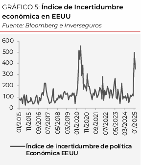 A lo largo de los últimos días se ha disparado cerca de máximos históricos la incertidumbre asociada a la política comercial, Trump ha generado un auténtico caos arancelario con agresivas tarifas que, en algunos casos, tras anuncios erráticos ha terminado posponiendo, la percepción del mercado se ha agravado de manera especial a raíz de sus últimas declaraciones a la cadena Fox donde no ha descartado una recesión, que los aranceles están aquí para quedarse, y que no van a ser solo una herramienta de negociación, sino que pretende forzar a las compañías para que produzcan en Estados Unidos, sobre todo en sectores estratégicos para la seguridad nacional como semiconductores, farmacia, acero o aluminio. Mientras las Bolsas Chinas han cerrado esta noche en máximos del año ante la esperanza de nuevos estímulos económicos.