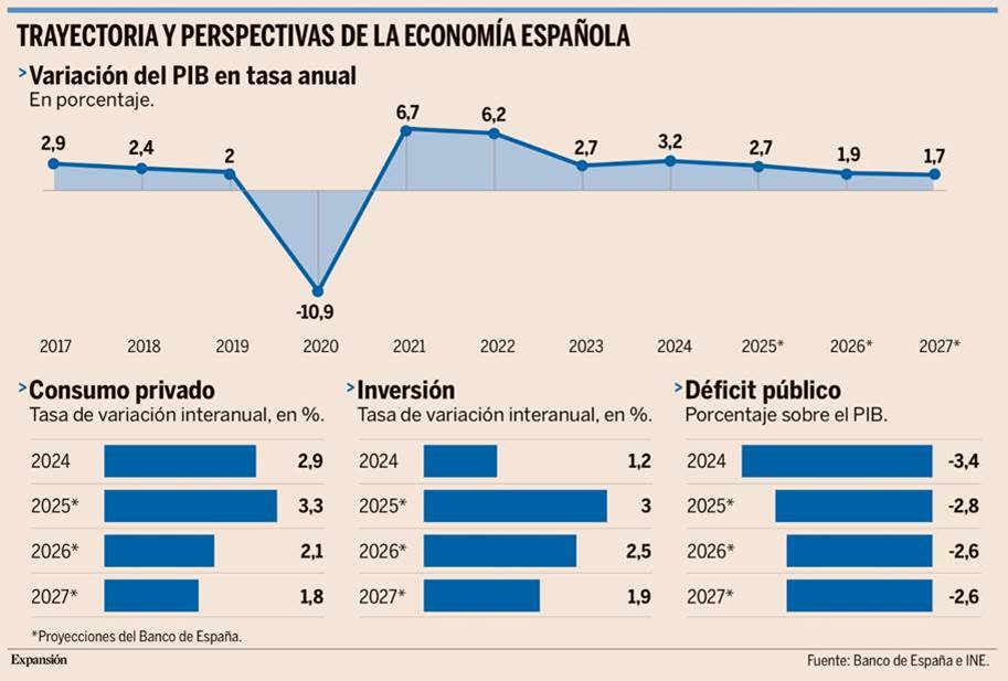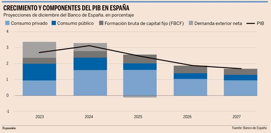En ese momento, los expertos de la autoridad monetaria estimaban que el PIB crecería en 2025 un 2,5%, con una clara desaceleración respecto a las cifras de 2024. BBVA y CaixaBank manejaban una cifra inferior, ya que calculaban el 2,3%.