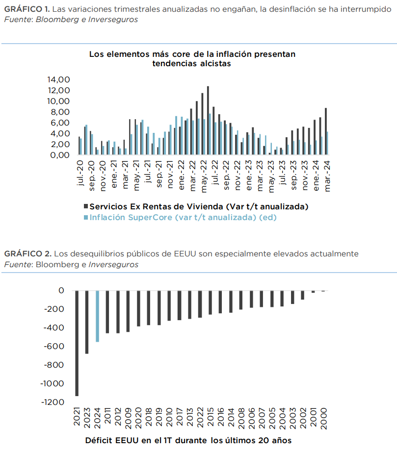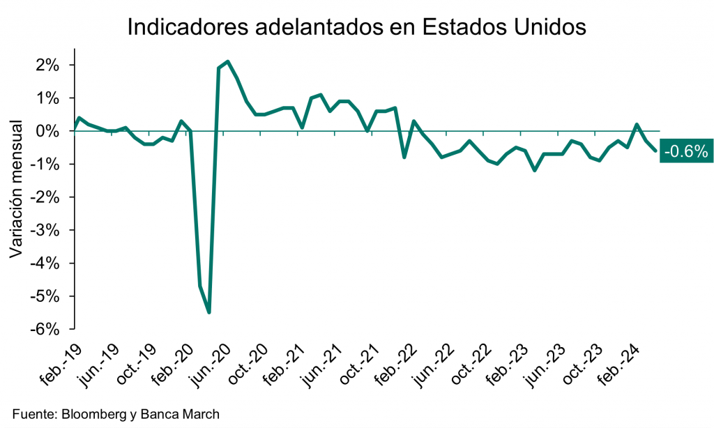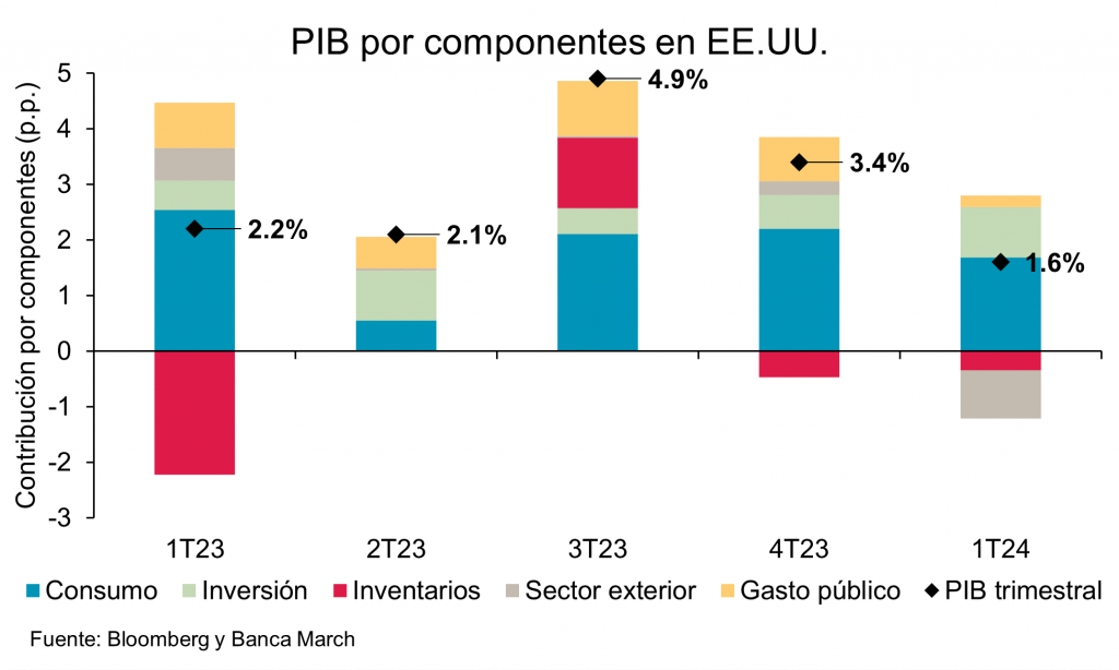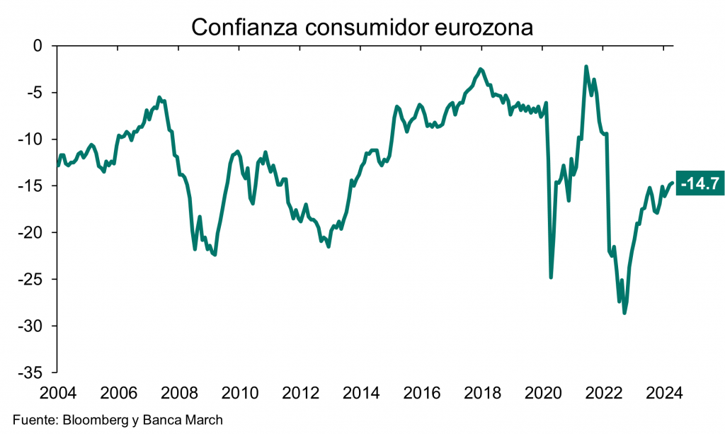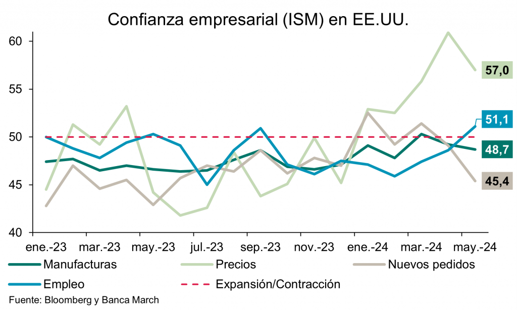 También en Estados Unidos, la revisión final del PIB del 1T24 deja pocas novedades en término de la tasa general, que avanza un +1,4% trimestral anualizado, una décima por encima del dato preliminar. Lo más destacado vino por el lado de los componentes, con un consumo privado menos dinámico al crecer un +1,5% trimestral anualizado frente al +2% publicado anteriormente. Con este dato, la contribución del consumo privado al PIB se situó en un 1%, que si sumamos a la contribución de la inversión (1,2%) y del gasto público (0,3%), observamos que la demanda interna de la economía estadounidense aportaría un crecimiento del +2,5%. Por el lado negativo, los inventarios (-0,4 p.p.) y el sector exterior (-0,65 p.p.), fueron los componentes que detrajeron crecimiento e impidieron un mayor dinamismo del PIB en los primeros meses del año. Por otro lado, las peticiones de subsidio por desempleo publicadas ayer se situaron en la última semana en 233 mil desde las 239 mil previas, alcanzando las solicitudes continuas su mayor nivel desde 2021. También fueron débiles los pedidos de bienes duraderos que aumentaron un +0,1% mensual frente al +0,2% anterior (dato revisado a la baja) y, si retiramos los componentes más volátiles como gasto en defensa y aviones, los pedidos de bienes duraderos registraron una contracción inesperada al caer un -0,6% mensual. En el sector inmobiliario, las cifras de ventas pendientes de vivienda retrocedieron nuevamente en mayo al caer un -2,1% mensual, confirmando que los elevados tipos de interés hipotecarios están frenando las transacciones.