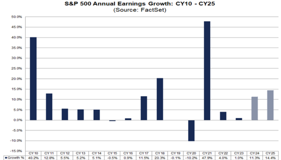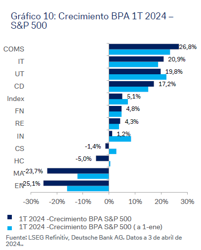 El consenso de analistas de mercado sigue esperando crecimientos de Beneficios Por Acción del S&P 500 superiores al 10% para 2024 y 2025 pero, con mucha dispersión por sectores (https://insight.factset.com/analysts-project-sp-500-to-report-double-digit-earnings-growth-for-2024-and-2025)