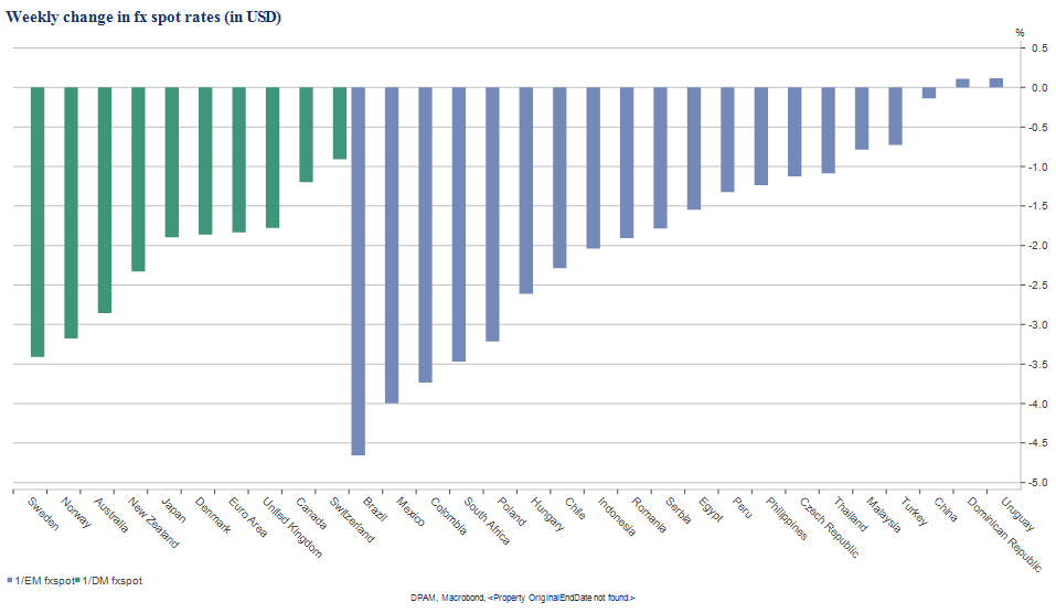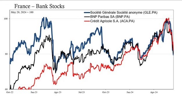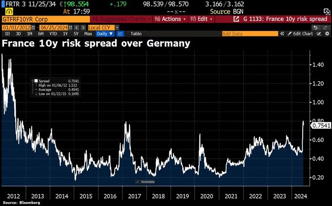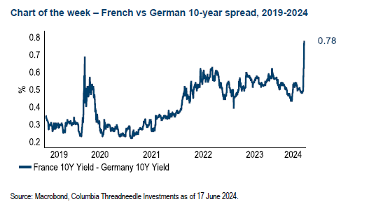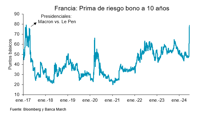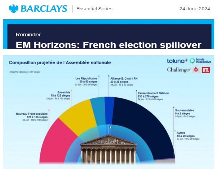 En Francia, Macron advertía esta semana que los partidos extremistas podrían desencadenar una «guerra civil». Por su parte, Tanguy, de Reagrupación Nacional (RN), reitera su compromiso de respetar los objetivos de déficit y añadió que Liz Truss «cavó su propia tumba». Por otra parte, nuevas encuestas de intención de voto elaboradas por Ifop y Harris recogen cómo el movimiento de Macron pierde terreno, mientras que RN y Nuevo Frente Popular ganan ligeramente. Según la última encuesta Ipsos del 22 de junio, el RN de Marine Le Pen-Bardella se mantiene a la cabeza de las encuestas (Rassemblement National 35,5%), seguida por la izquierda NPF (Nuevo Frente Popular 29,5%) y la coalición centrista de Macron (19,5%). Aunque se prevé que el RN consiga la mayoría, no se espera que ésta sea absoluta (289). En caso de cohabitación (Macron y primer ministro de otro partido), Macron sería responsable de Asuntos Exteriores y Defensa, mientras que sobre el primer ministro recaería la responsabilidad de la política doméstica. Según declaraciones de Tanguy, el más probable candidato a hacerse con el Ministerio de Finanzas en caso de victoria de Le Pen, apuntan a su compromiso con el respeto a las reglas fiscales europeas, intentando calmar a un mercado que teme una menor disciplina fiscal en caso de victoria tanto del RN como del NPF, a añadir a una situación fiscal ya de por sí complicada, en 2023, déficit público del 5,5%, deuda pública 111% y apertura de Procedimiento de Déficit Excesivo. En este contexto, la prima de riesgo francesa ha repuntado 30 puntos básicos, hasta niveles de 80 puntos, desde que Macron convocó elecciones anticipadas.