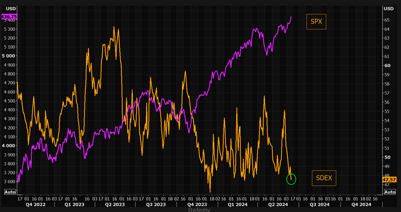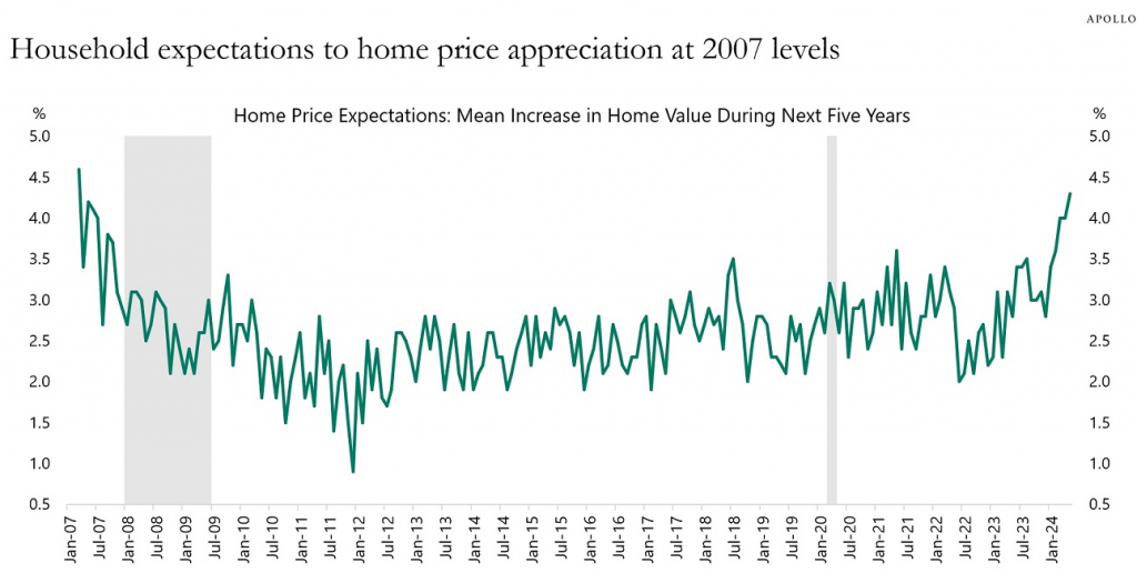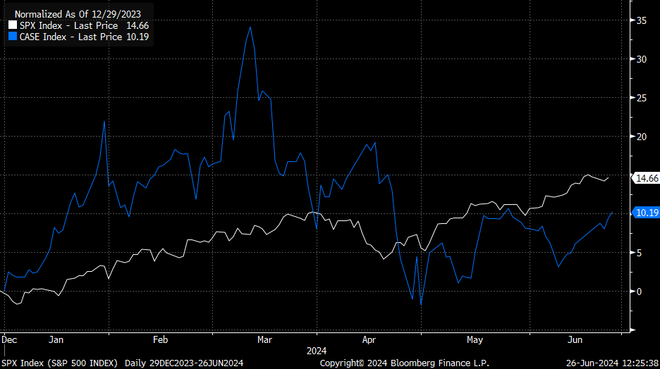 S&P Case-Shiller (línea azul) Vs S&P 500 (línea blanca) 2024.