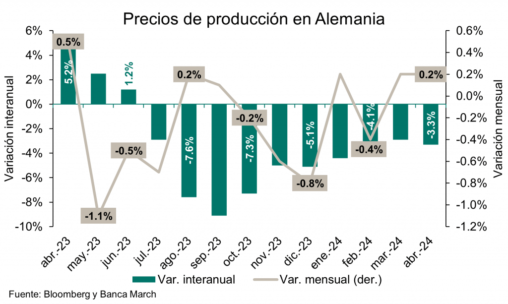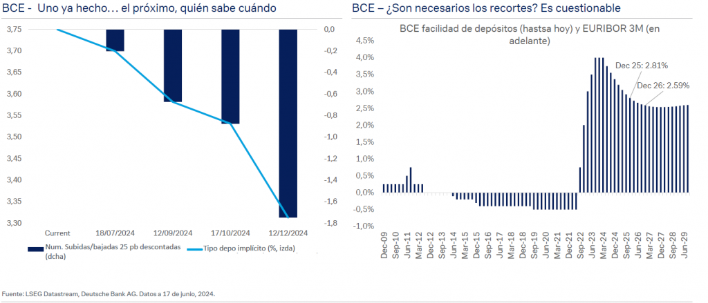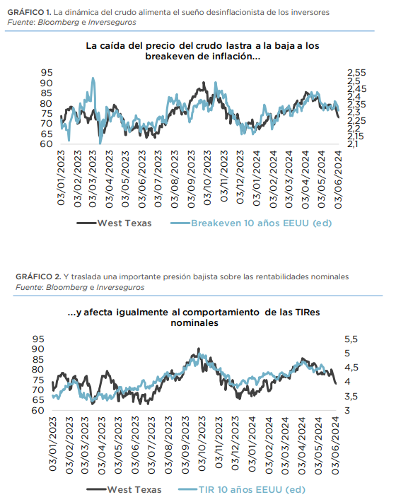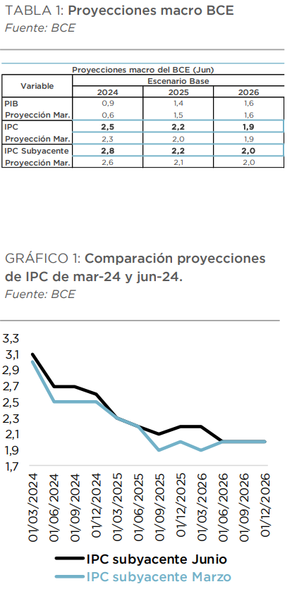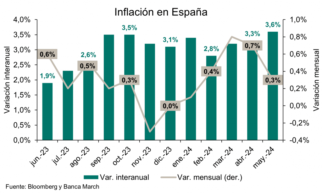 Esta mañana, también en España, hemos conocido el dato de inflación que se ha moderado en junio. Según el indicador adelantado del INE, el IPC registraría un crecimiento en junio del +3,4% interanual, dos décimas menos que en el mes previo. Aunque todavía no se han publicado los componentes, según adelanta el INE, esta evolución se explica principalmente por la bajada de los precios de los carburantes, frente a la subida de junio de 2023. También, el aumento de los precios de la alimentación fue menor que en el mismo mes del año pasado. En sentido contrario, destaca la influencia al alza de ocio y cultura, cuyos precios suben más que en junio del año pasado. Con todo ello, la tasa de inflación subyacente (índice general sin alimentos no elaborados ni productos energéticos) se mantiene en el +3% interanual, la misma que la registrada en mayo.
