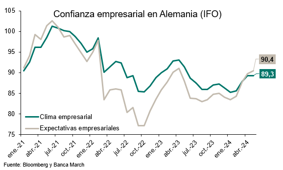Esta semana conocimos en Alemania que en junio el índice IFO de clima empresarial cayó inesperadamente al retroceder hasta 88,6 desde el 89,3 anterior y por debajo del 89,6 esperado por los analisyas. Un dato que apunta a un freno en las expectativas de mejora de la actividad y que señala que la reactivación de la economía germana será lenta. Por componentes, este retroceso se explicó por la caída del sub-índice de expectativas, 89 frente al 90,3 anterior, mientras que el sub-índice de situación actual se mantuvo sin cambios en niveles de 88,3.
