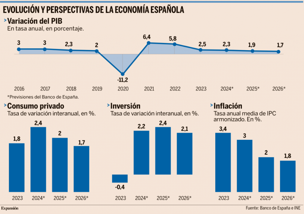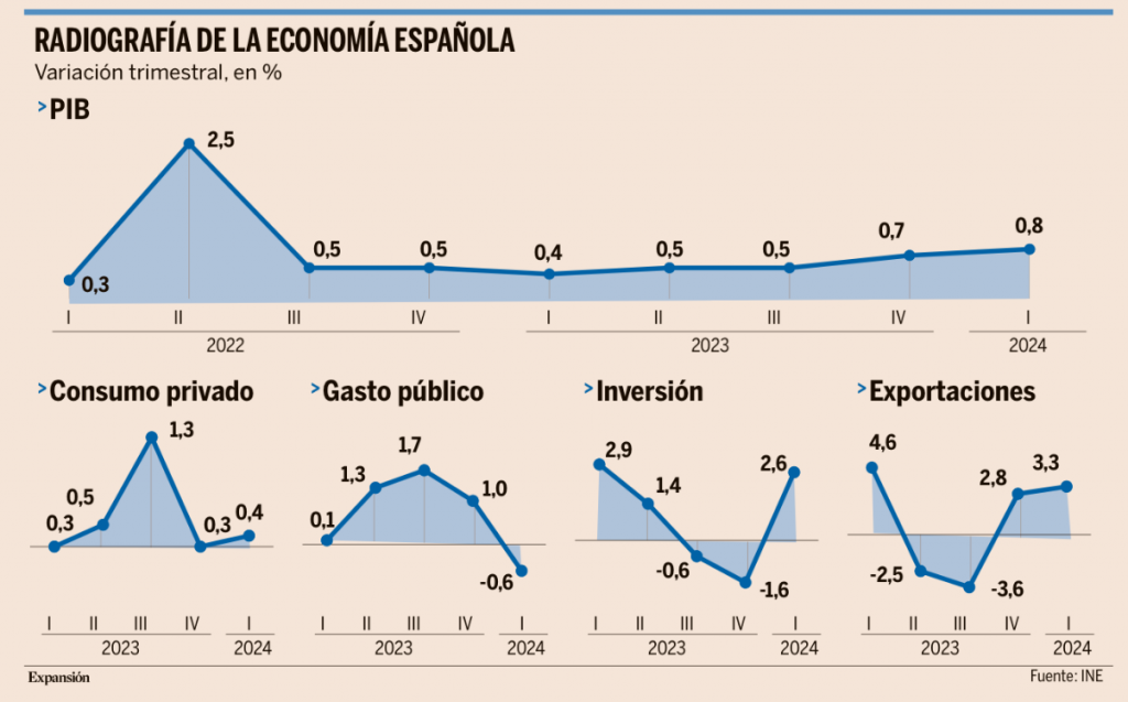 En España, el martes se publicó la revisión del PIB del 1T24 que muestra un mayor dinamismo de la economía. En los tres primeros meses del año, la economía española creció un +0,8% trimestral, una décima por encima del dato publicado anteriormente. Con ello, el ritmo de crecimiento interanual se elevó hasta el +2,5%, por encima del +2,1% anterior. En este caso, la demanda nacional portó 2,3 puntos mientras que la demanda externa contribuyó con 0,2 puntos. Desde la óptica de la oferta, todos los grandes sectores de actividad presentaron tasas interanuales positivas, el valor añadido bruto de la industria fue del +2,3% y, dentro de las mismas, la industria manufacturera se incrementó un +3,4%. El valor añadido bruto de la construcción creció +3,3% respecto al mismo trimestre de 2023 y los servicios un +2,7%. Por su parte, las ramas primarias quedaron rezagadas con un crecimiento del +1%.