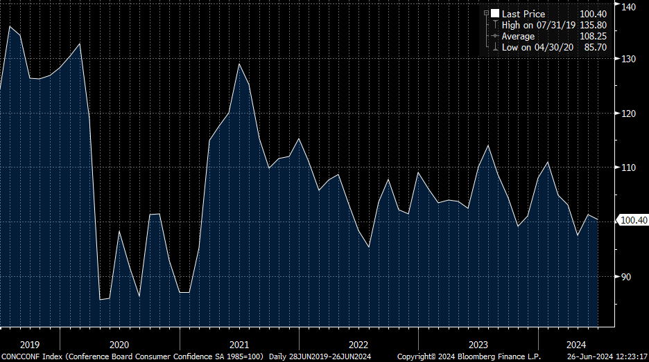 En Estados Unidos se frena la confianza de los consumidores. El índice de la Conference Board bajó en junio, aunque algo menos de lo esperado, en concreto, este indicador se situó en 100,4 desde el 101,3 anterior y ligeramente por encima del 100 previsto. Esta menor confianza vino principalmente explicada por el descenso del componente de expectativas (73 vs. 74,9 previo), dado que la lectura de la situación actual mejoró (141,5 vs. 140,8 previo).