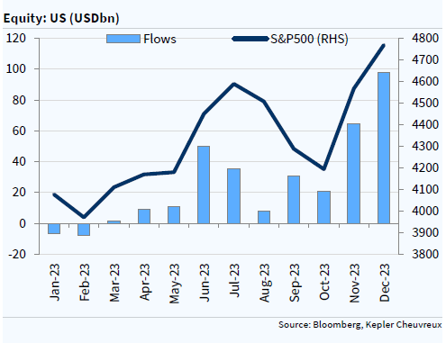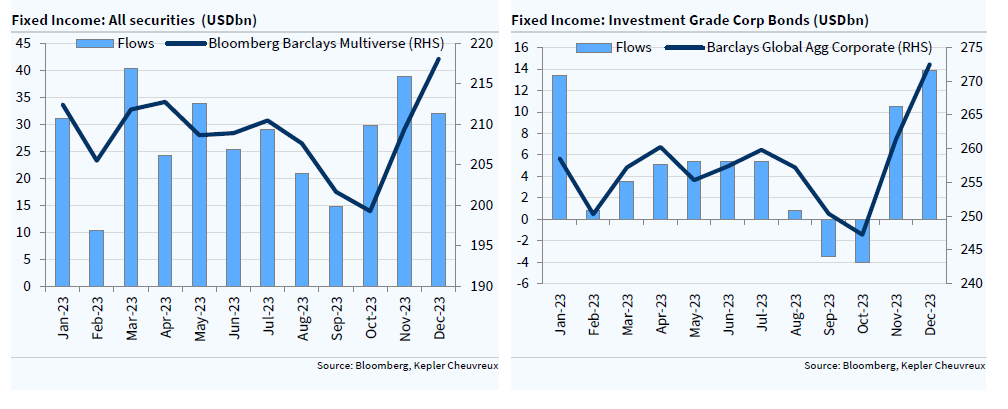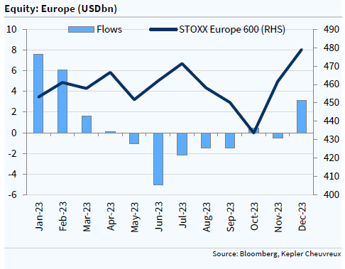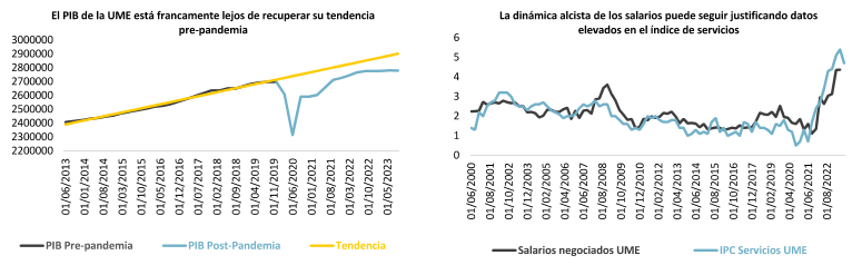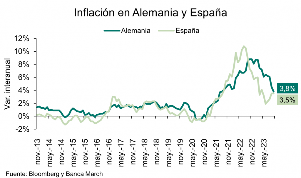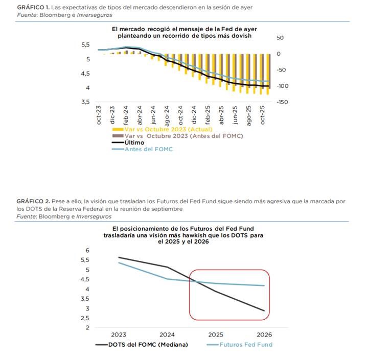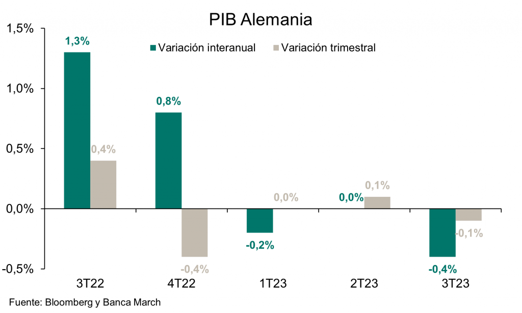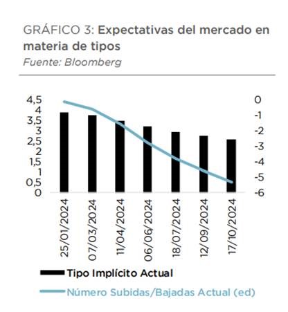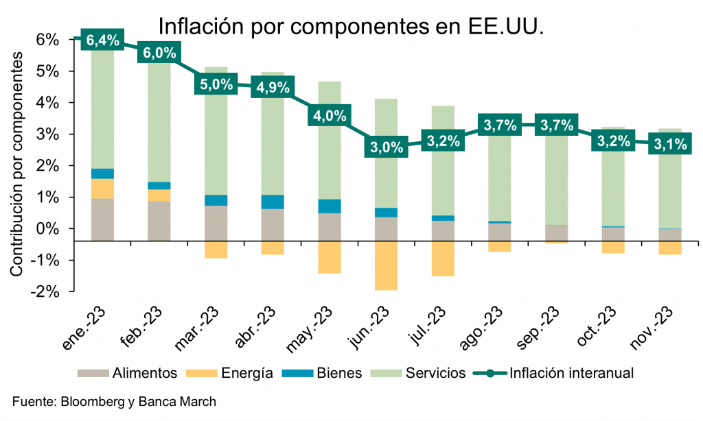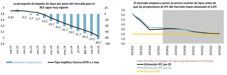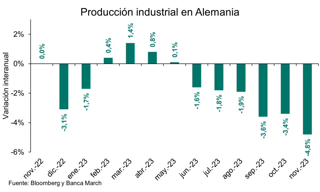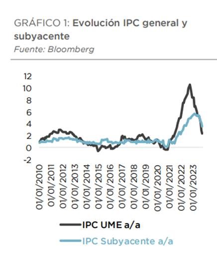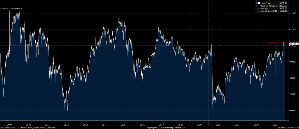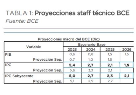En Europa los datos de empleo en la eurozona fueron mejor de lo esperado, lo que dejó la tasa de paro en el mínimo desde el inicio de la unión monetaria (6,4%). De Guindos advertía esta semana de una recesión técnica en el conjunto de la zona euro que habría empezado en la segunda mitad de 2023. En el tercer trimestre de 2023, se produjo una desaceleración de la actividad económica que, de acuerdo con las declaraciones del vicepresidente del BCE, podría extenderse al último trimestre del año. La debilidad de la actividad afectaría principalmente a la construcción y las manufacturas, aunque el sector servicios también se verá afectado en los próximos meses. En cuanto al mercado laboral, se muestra particularmente resistente, con una tasa de paro en noviembre (6,4%) en mínimos históricos. No obstante, hay indicadores que señalan un posible enfriamiento tanto por la disminución en las horas trabajadas como en tasa de puestos vacantes. Por otro lado, comentó que el proceso de desinflación ha resultado satisfactorio hasta la fecha, el IPC en la eurozona en diciembre fue del 2,9% frente al 9,2% en el mismo mes de 2022, y la inflación subyacente también se contiene paulatinamente. Sin embargo, De Guindos dijo que la trayectoria hacia el objetivo del 2% se verá ralentizada durante el 2024. Con la retirada de las medidas de los precios de la energía, se espera un repunte en la evolución de los precios.