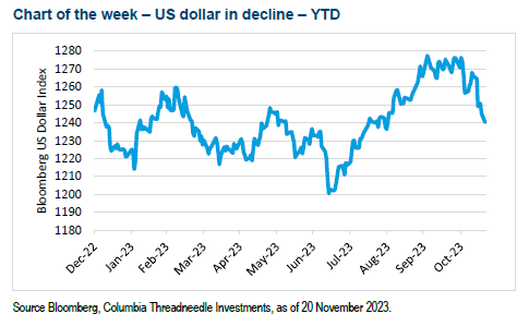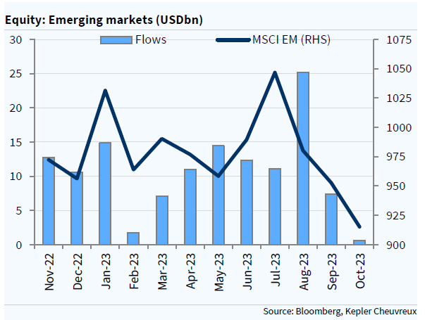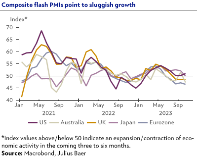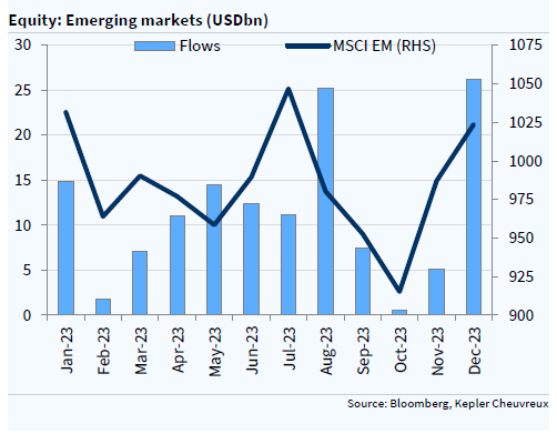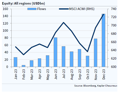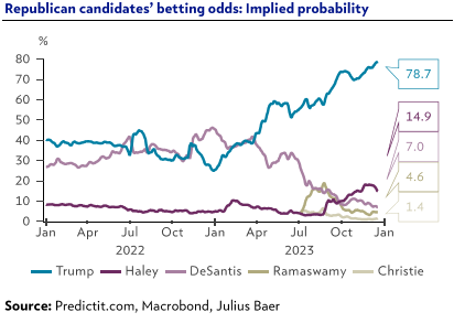 ¿Seguirán resistiendo las bolsas mundiales? Las acciones estadounidenses acapararon toda la atención en 2023, pero en el resto del mundo también hubo ganadores. Los inversores se entusiasmaron con el alza de Japón debido al impulso de la reforma empresarial y el fin de la deflación. Como resultado, un inversor en dólares estadounidenses sin cobertura habría ganado un 19% si hubiera invertido en el Topix en 2023. Los mercados emergentes, excluyendo China, tuvieron también un año muy bueno (rentabilidad total en dólares: 20%) gracias a la subida de las bolsas indias y a que muchos bancos centrales de mercados emergentes resistieron bien el endurecimiento de la política monetaria de la Fed. Incluso en Europa, a pesar de los efectos negativos del estancamiento del crecimiento alemán y holandés y de la inflación subyacente, la renta variable fue muy bien (rentabilidad total en dólares del 20%).
