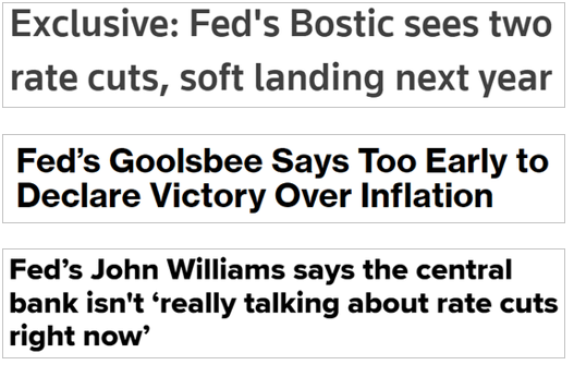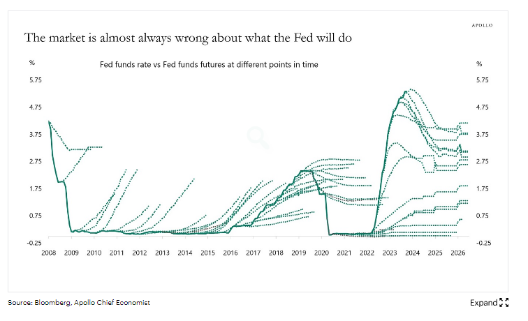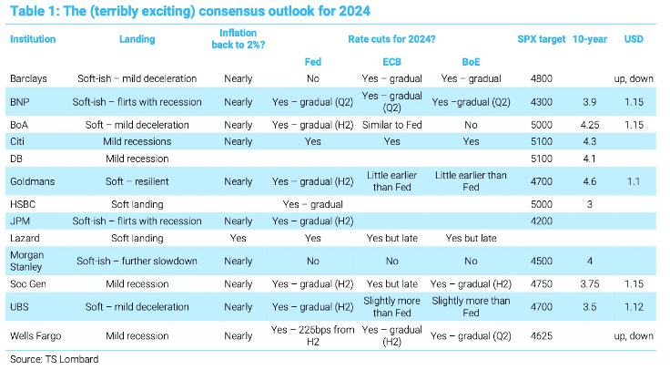 ¿Cuál será el ritmo de las bajadas de tipos de interés? El consenso es que es muy probable que se produzcan varias bajadas del tipo de interés oficial de la Reserva Federal. Los mercados de renta variable lo consideran una buena noticia. Pero hay dos formas de bajadas de tipos de interés, las provocadas por la desinflación y las provocadas por la desaceleración económica. Estas últimas son malas para la renta variable. El consenso apunta a que habrá seis recortes de tipos de 25 puntos básicos provocados por la pura desinflación, más que por la preocupación por la ralentización económica o la caída del crecimiento. Pero recordemos cuál era el consenso casi universal hace un año (que habría una recesión) y que no se cumplió.