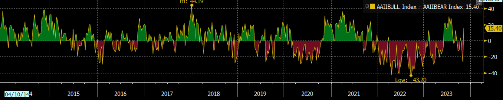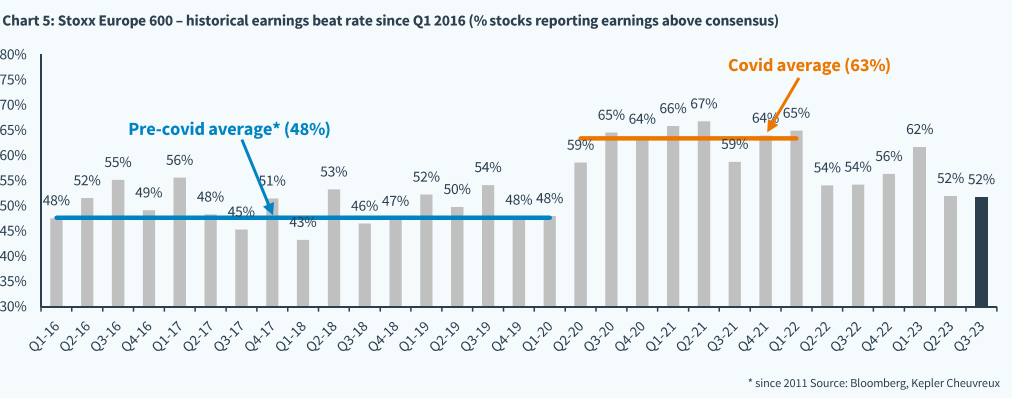 En Europa Kepler publicaba esta semana su informe sobre las expectativas de resultados empresariales para Europa, en el informe comentan que ven las mismas dinámicas que en Estados Unidos, el consenso ha estado bajando agresivamente estimaciones de Beneficio por acción para el cuarto trimestre del 2023. En Octubre del 2023 se esperaba para el Stoxx 600 una caída del -2.5% interanual en ingresos y en los últimos días ha caído esa estimación hasta el -6.4%. Las expectativas por tanto vuelven a estar bajas de cara a la publicación de resultados, con lo que hay una mayor probabilidad de batir al consenso, pero el mercado ha subido mucho en los últimos 2 meses con lo que veremos si sigue siendo sostenible una subida.