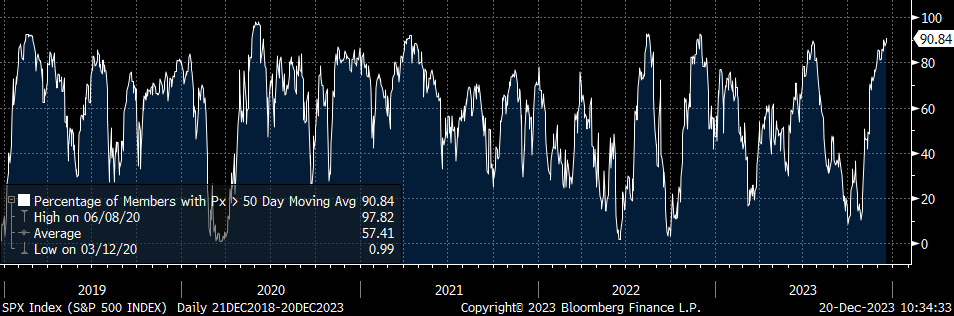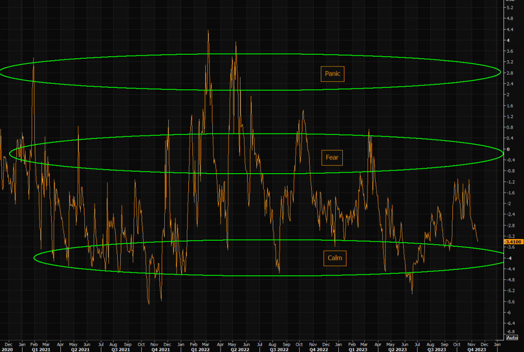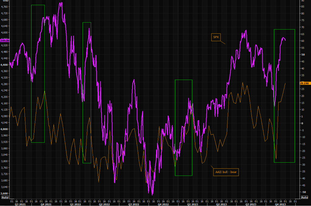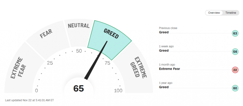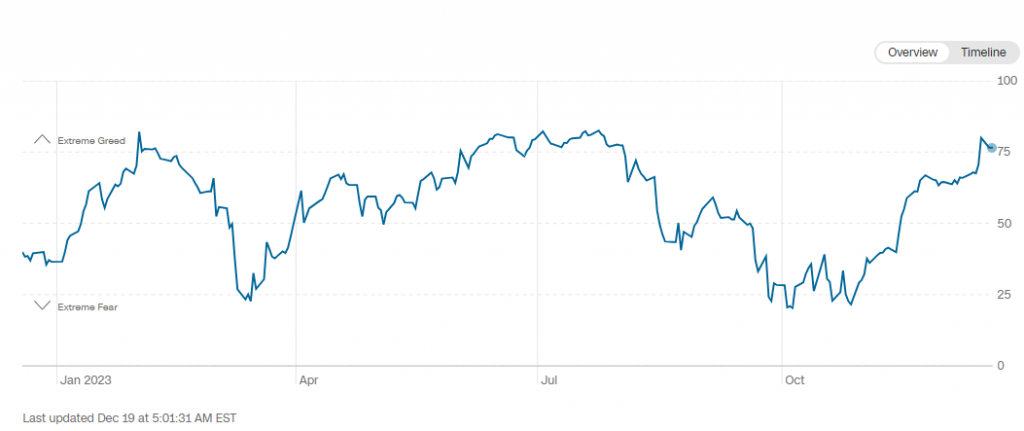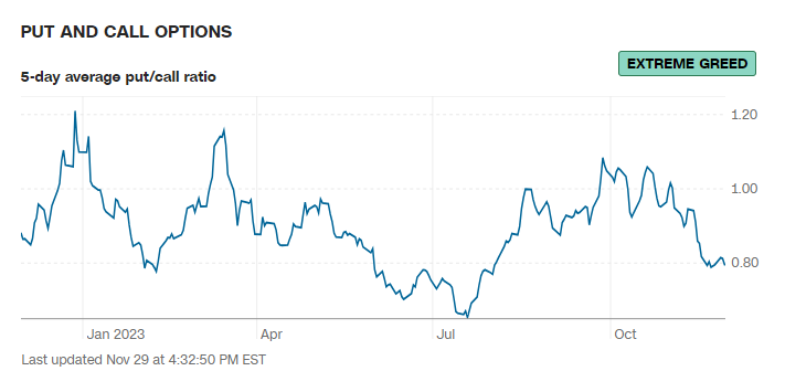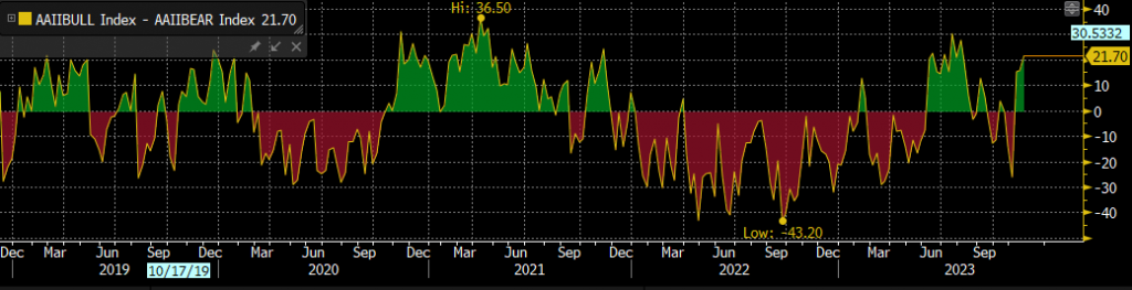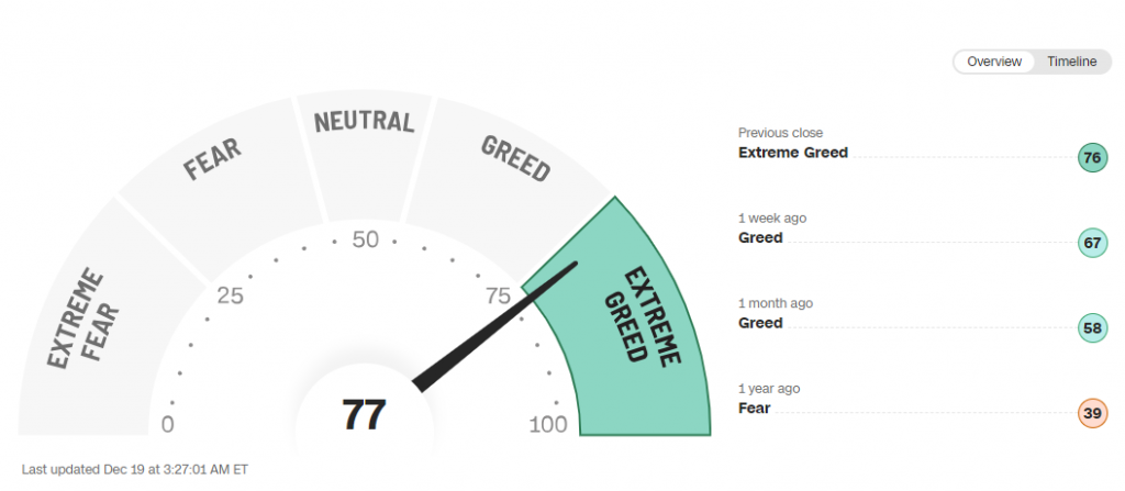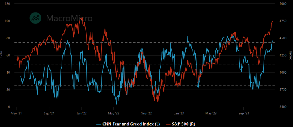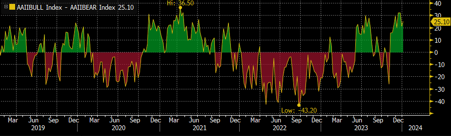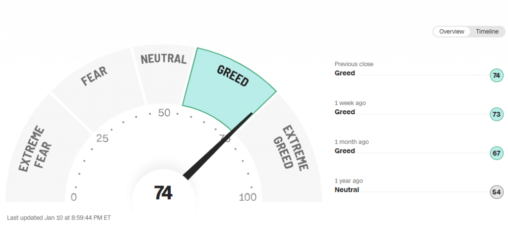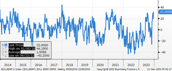 El índice alcistas menos bajistas (Bulls minus Bears) sigue en la parte alta del rango pese al inicio del año, igual que el índice miedo/euforia (Fear & Greed Index) de la CNN que sigue en Gredd (https://edition.cnn.com/markets/fear-and-greed).
