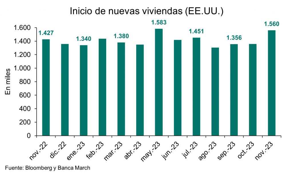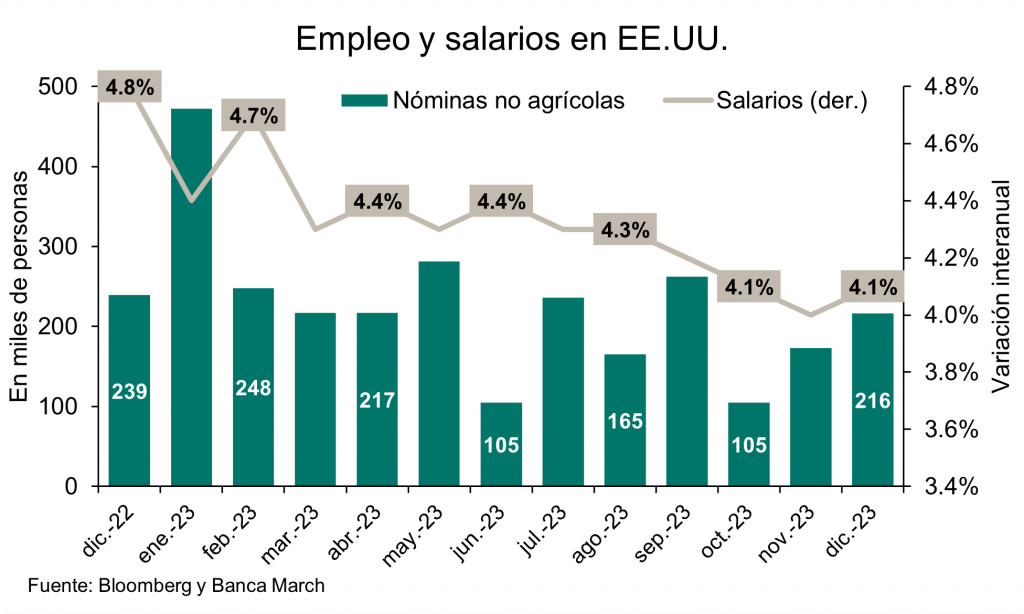 Los datos de creación de empleo en Estados Unidos siguen mostrando un mercado laboral sólido a finales de 2023, lo que aplazaría la necesidad de una pronta bajada de tipos de interés. No obstante, el mercado sigue asignando una alta probabilidad a una reducción de tipos oficiales dentro de la primera mitad de año algo que parece bastante improbable pues la inflación se normalizará de manera más pausada que en 2023. Como se vio en el dato de empleo de Estados Unidos del viernes pasado, la economía continúa creando empleo a buen ritmo, pero en diciembre los datos oficiales dejaron señales mixtas. Por el lado positivo, la creación de empleo según las empresas superó las expectativas, al crearse 216 mil nuevos puestos de trabajo frente a los 173 mil del mes previo, dato que se revisó a la baja desde los 199 mil publicados anteriormente. La mayor contribución a este incremento del empleo vino por el sector de cuidados de la salud y educación (+74 mil), seguido del sector público (+52 mil) y de ocio y restauración (+40 mil). Por el lado de los salarios, avanzaron en el mes un +0,4%, lo que elevó su ritmo de crecimiento hasta el +4,1% interanual, una décima por encima del mes anterior. Sin embargo, la encuesta de empleo a los hogares dejó datos heterogéneos, la tasa de paro repitió niveles del 3,7%, una décima por debajo de lo esperado. Este comportamiento se debió a una bajada de la población activa (62,5% desde el 62,8% anterior) y no a una mayor creación de empleo como apuntaron los otros datos publicados. En conjunto, las cifras siguen mostrando la resiliencia del mercado laboral, aunque con señales de menor dinamismo.